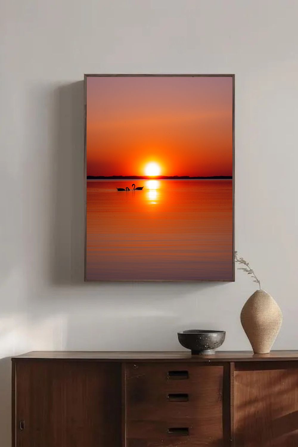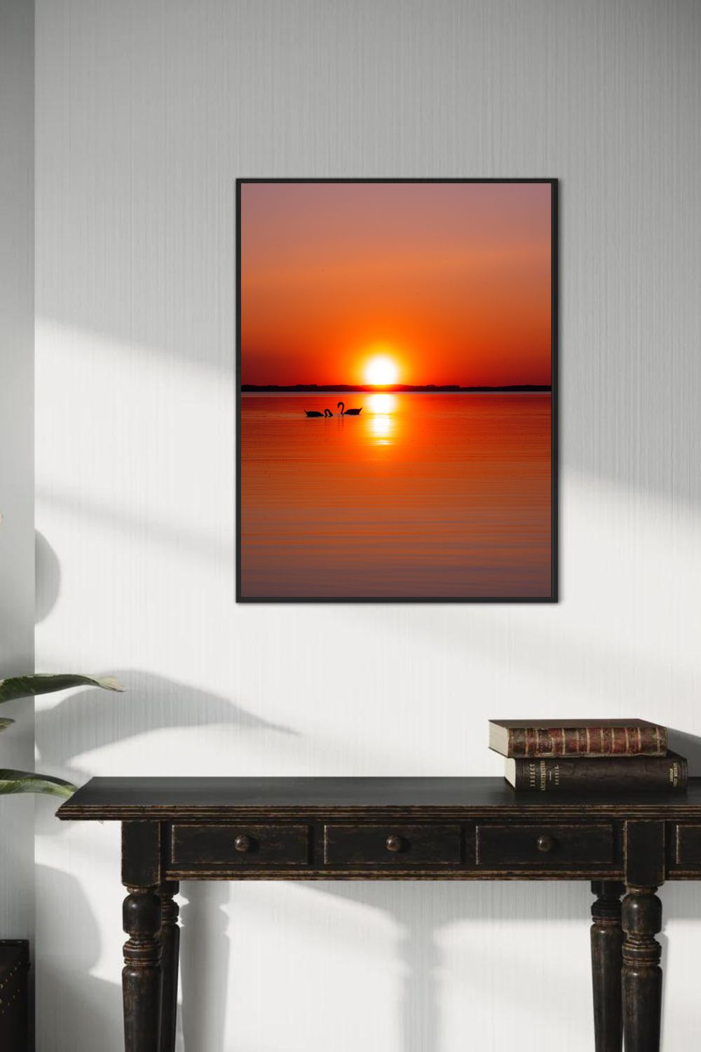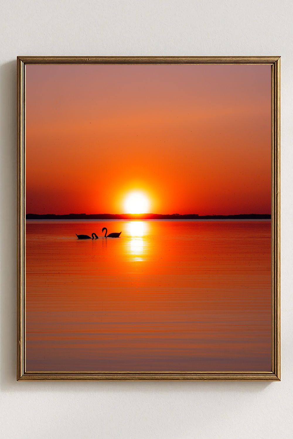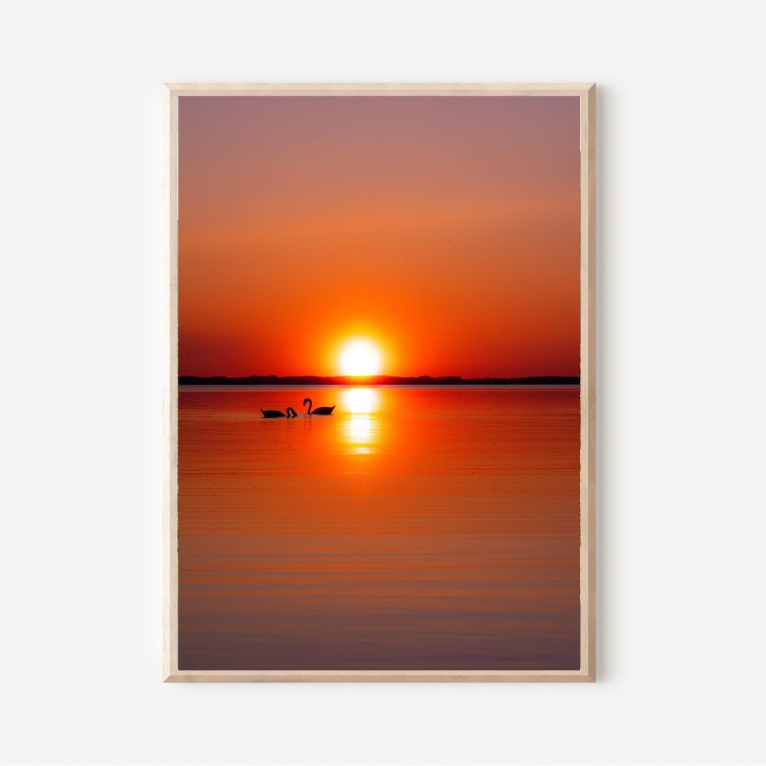 Cette photographie capture deux cygnes flottant dans la douceur d’un ciel incandescent. Le soleil bas embrase l’horizon, les reflets se déploient en arabesques dorées, et le calme devient palpable.