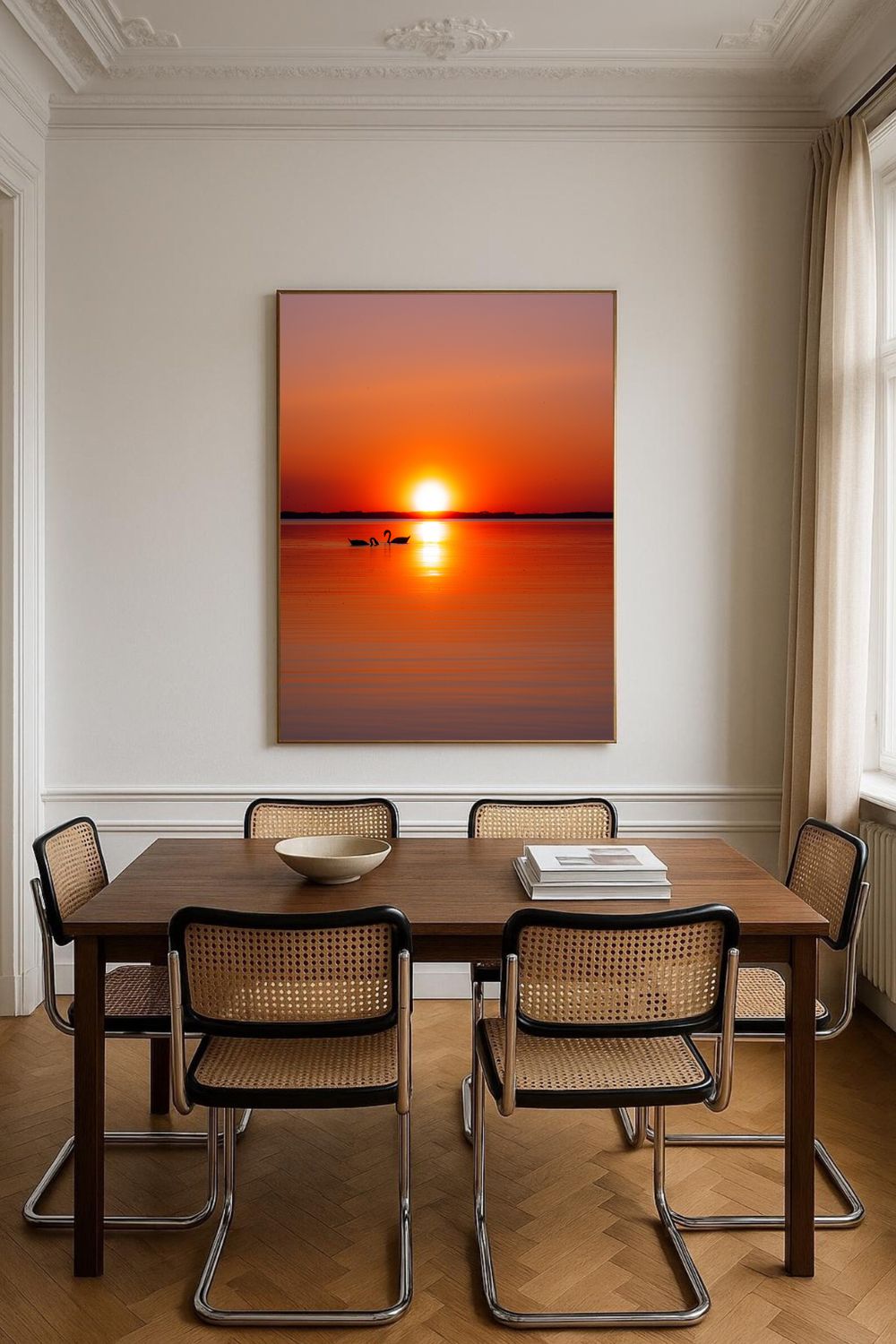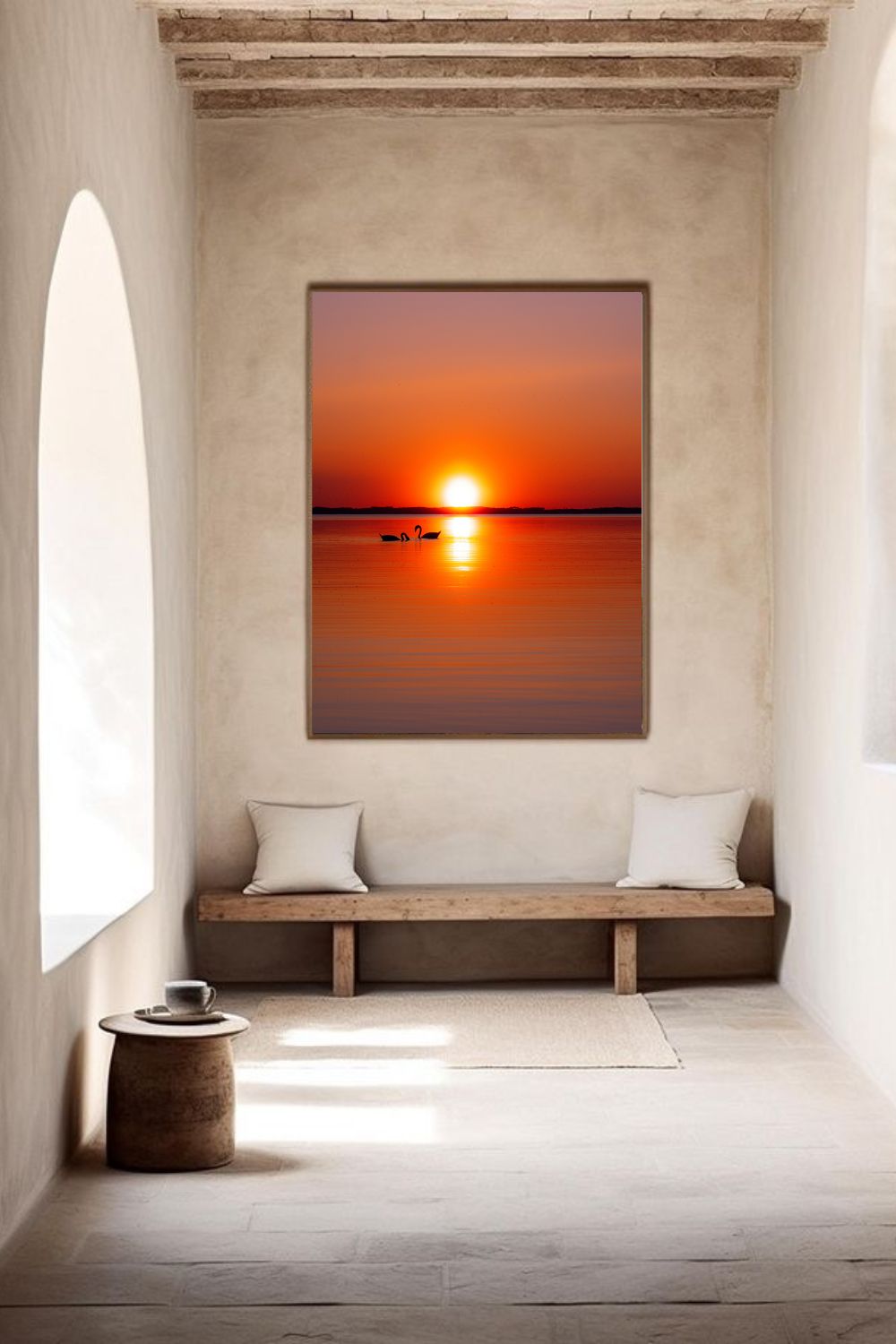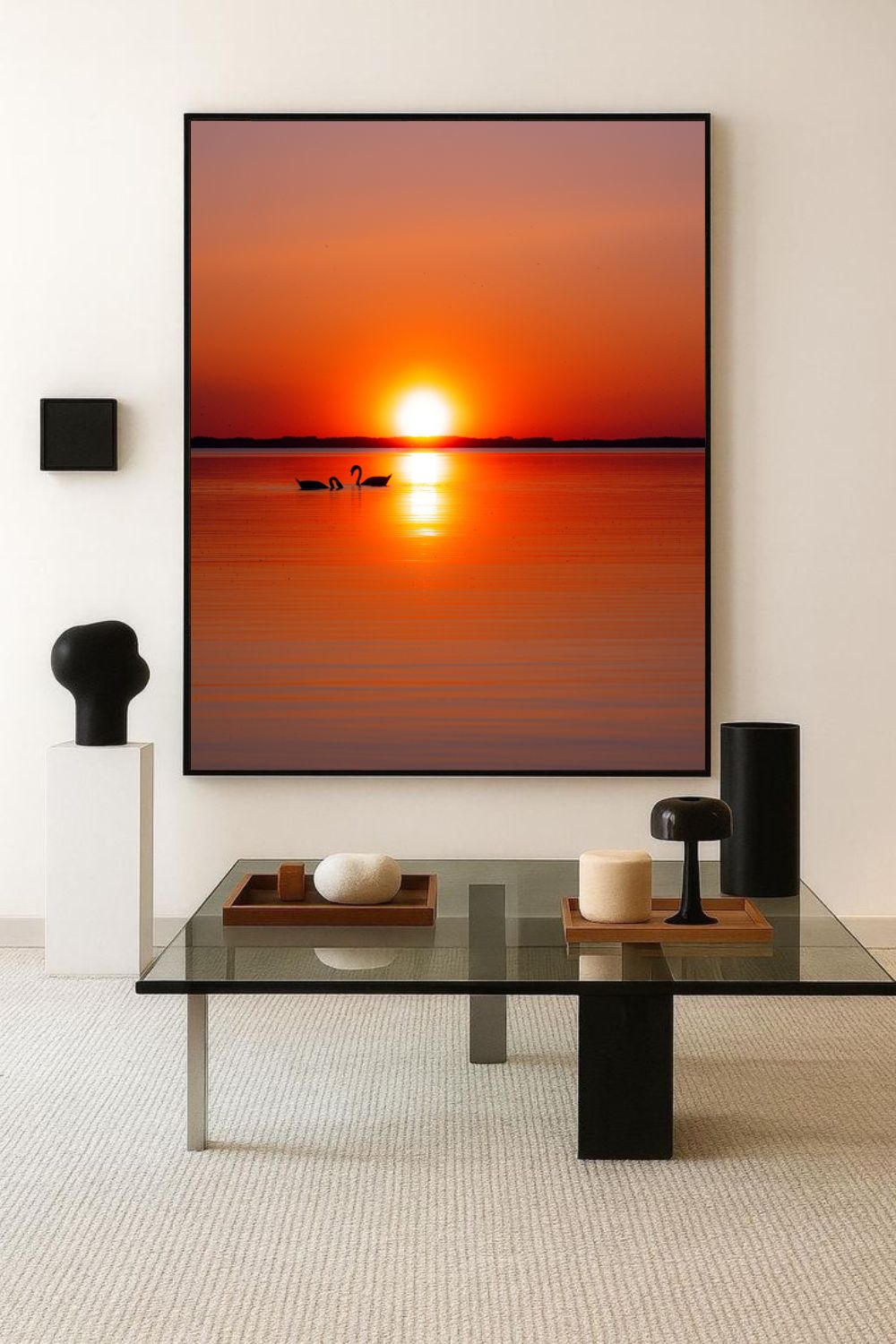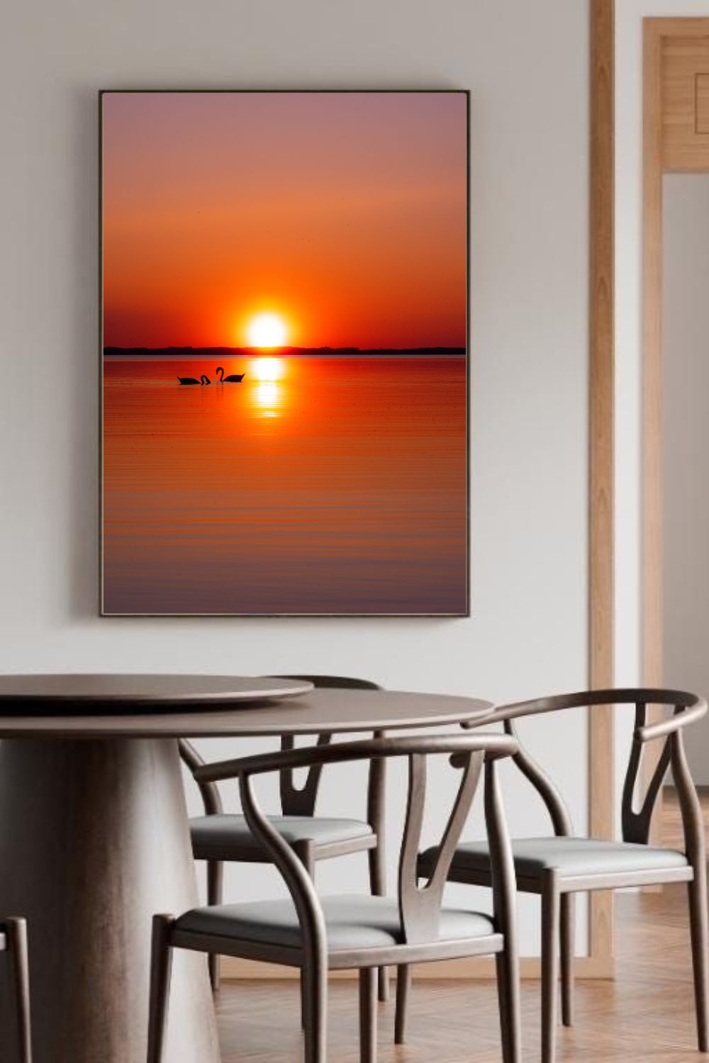 Cette photographie capture deux cygnes flottant dans la douceur d’un ciel incandescent. Le soleil bas embrase l’horizon, les reflets se déploient en arabesques dorées, et le calme devient palpable.