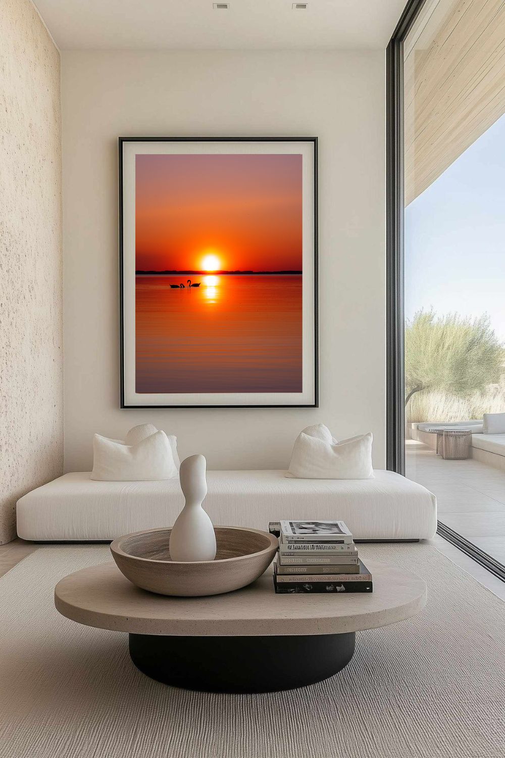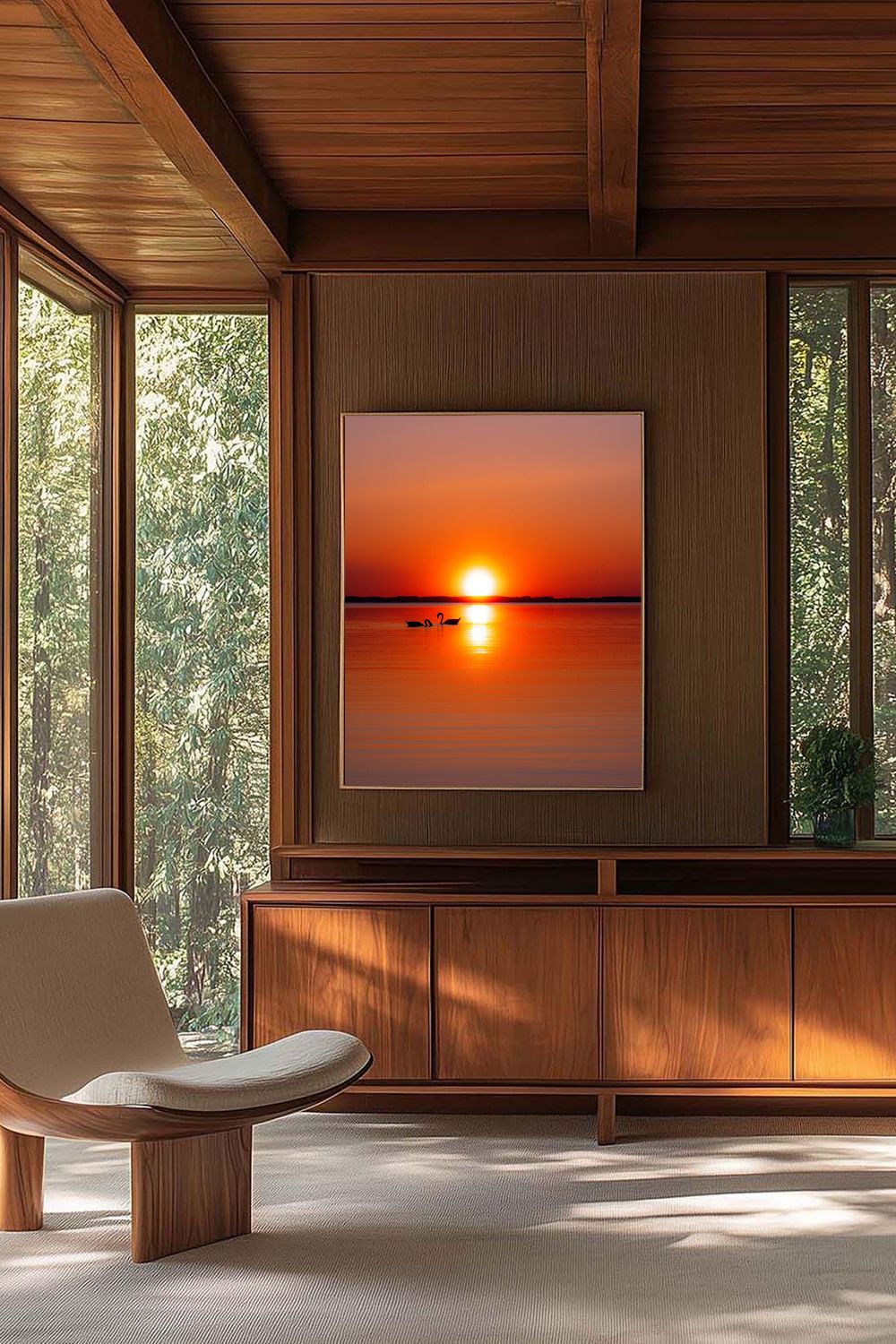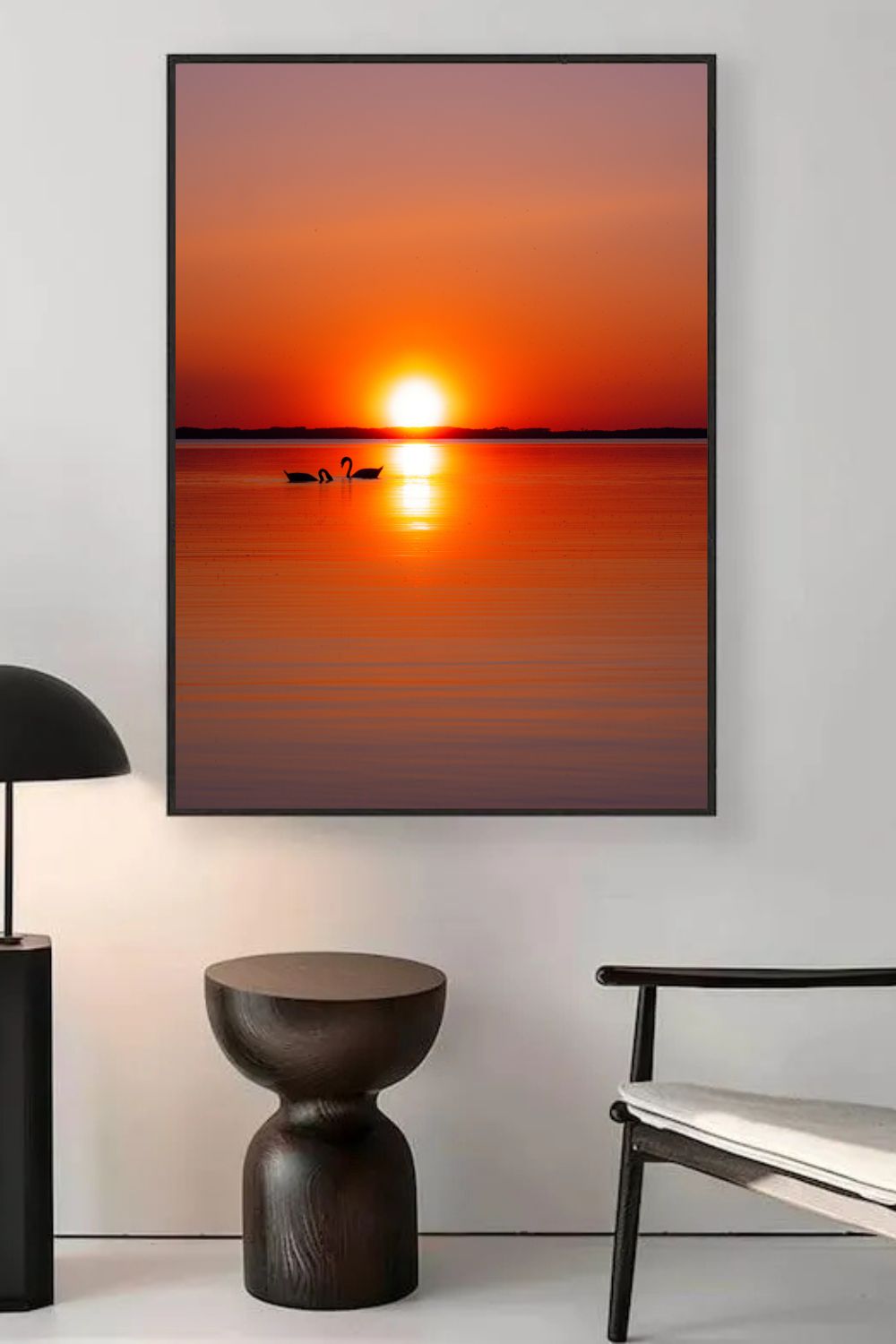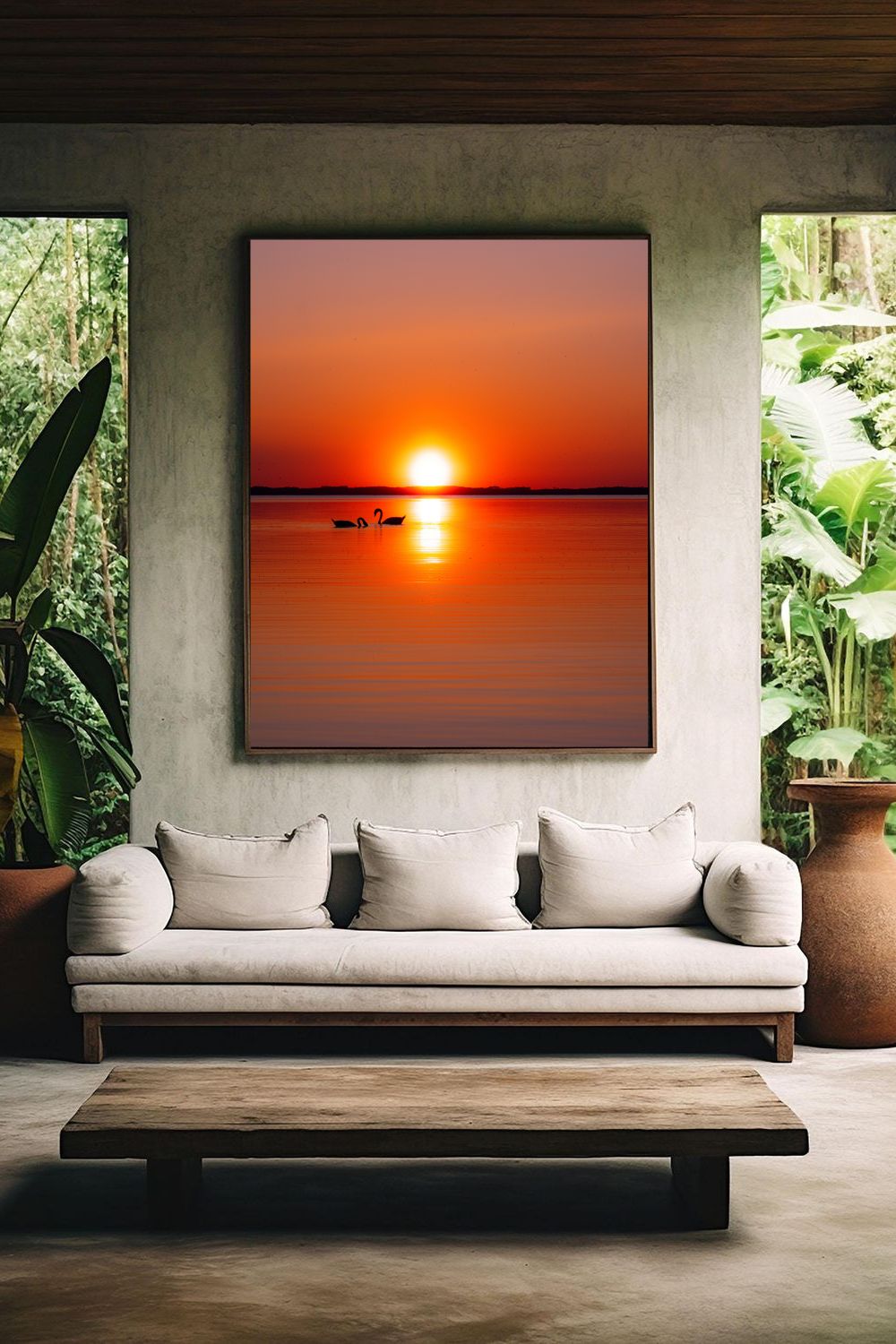 Cette photographie capture deux cygnes flottant dans la douceur d’un ciel incandescent. Le soleil bas embrase l’horizon, les reflets se déploient en arabesques dorées, et le calme devient palpable.