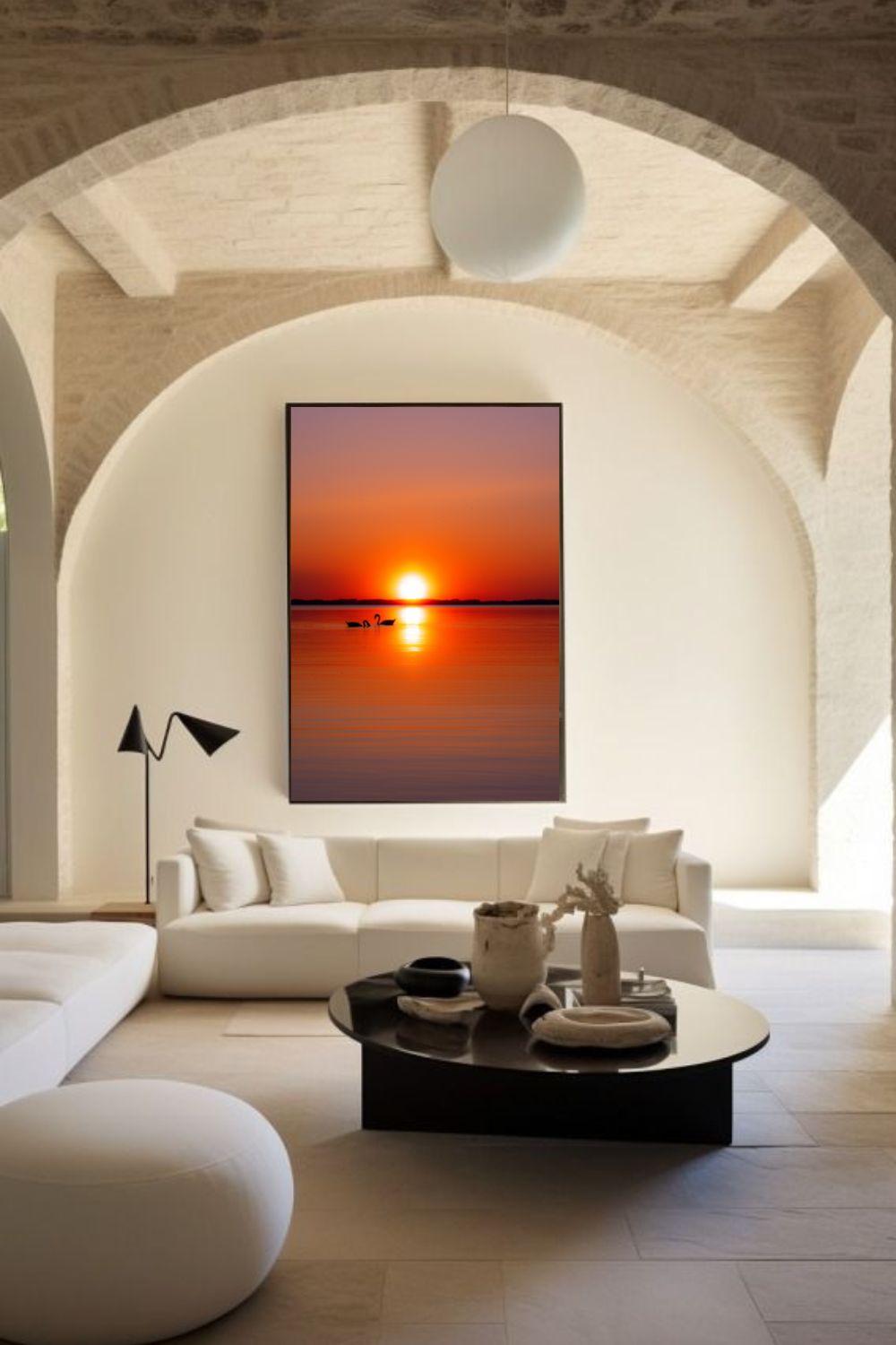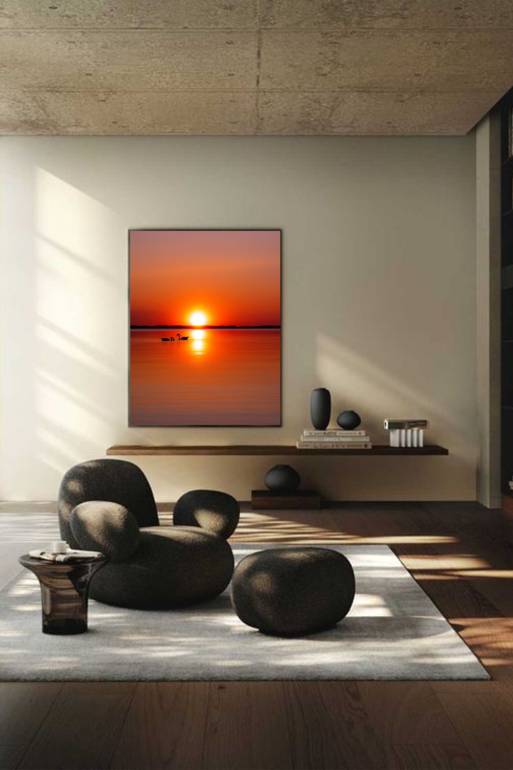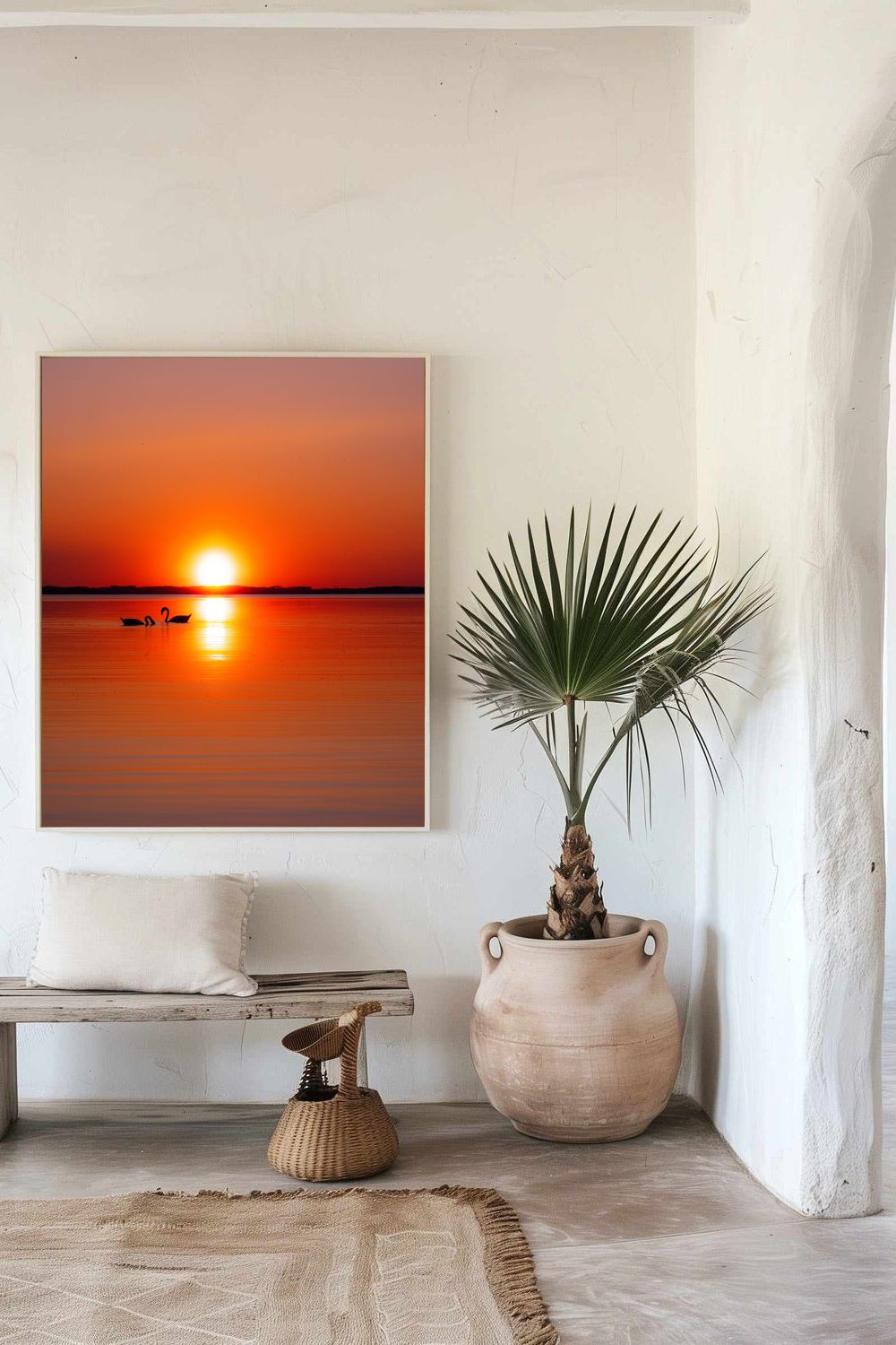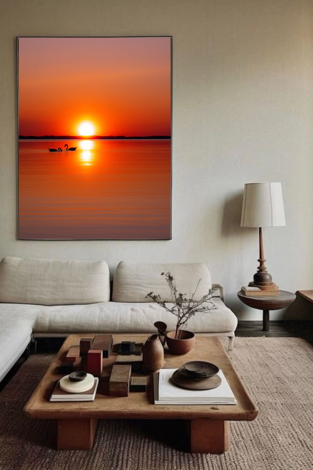 Cette photographie capture deux cygnes flottant dans la douceur d’un ciel incandescent. Le soleil bas embrase l’horizon, les reflets se déploient en arabesques dorées, et le calme devient palpable.