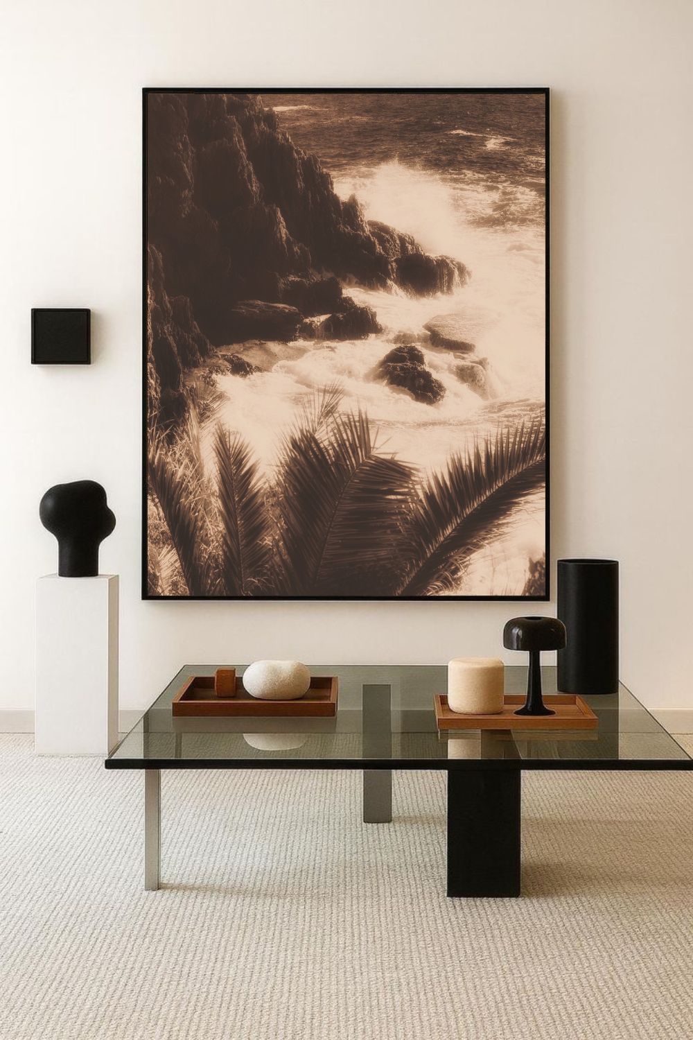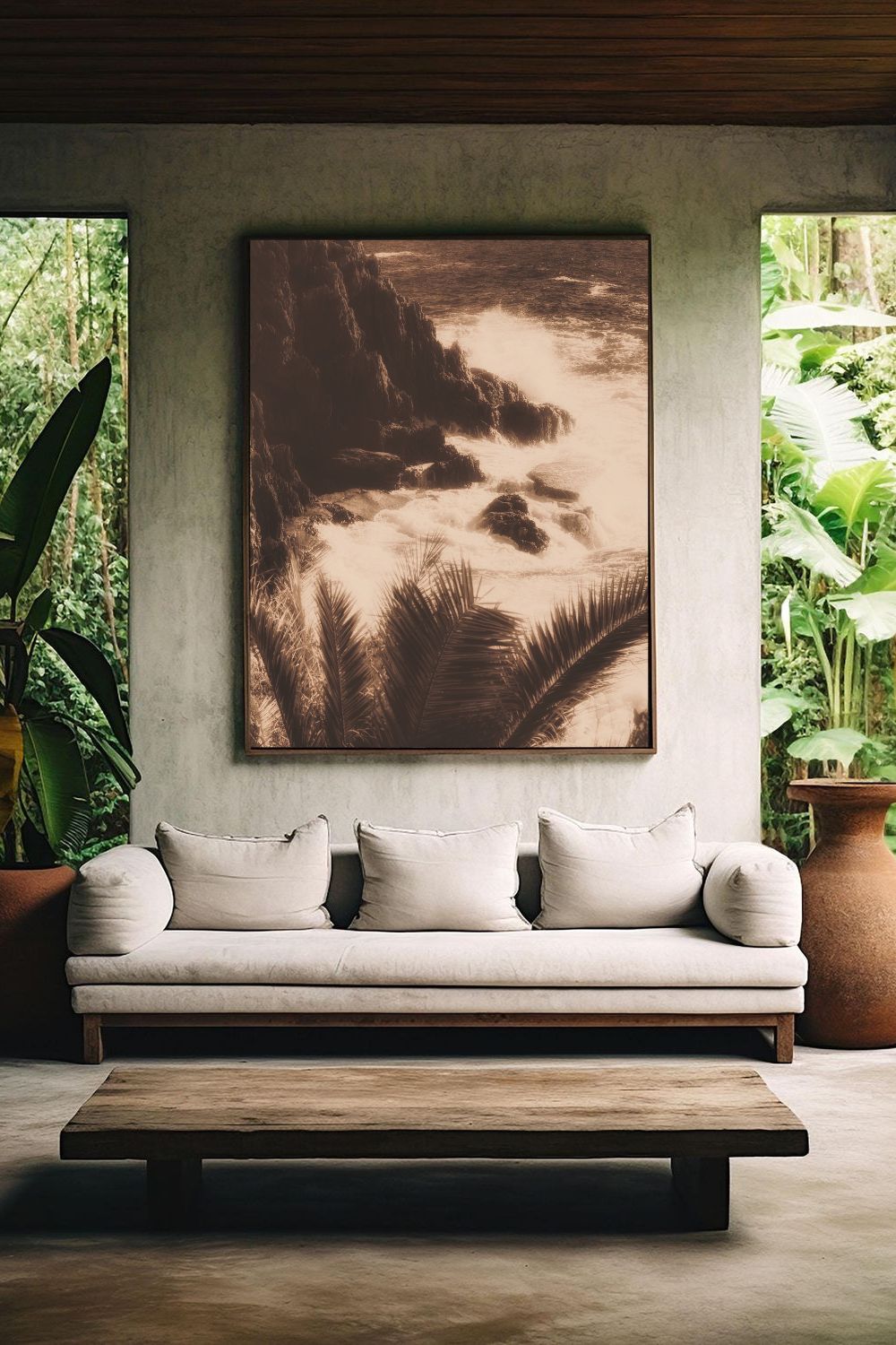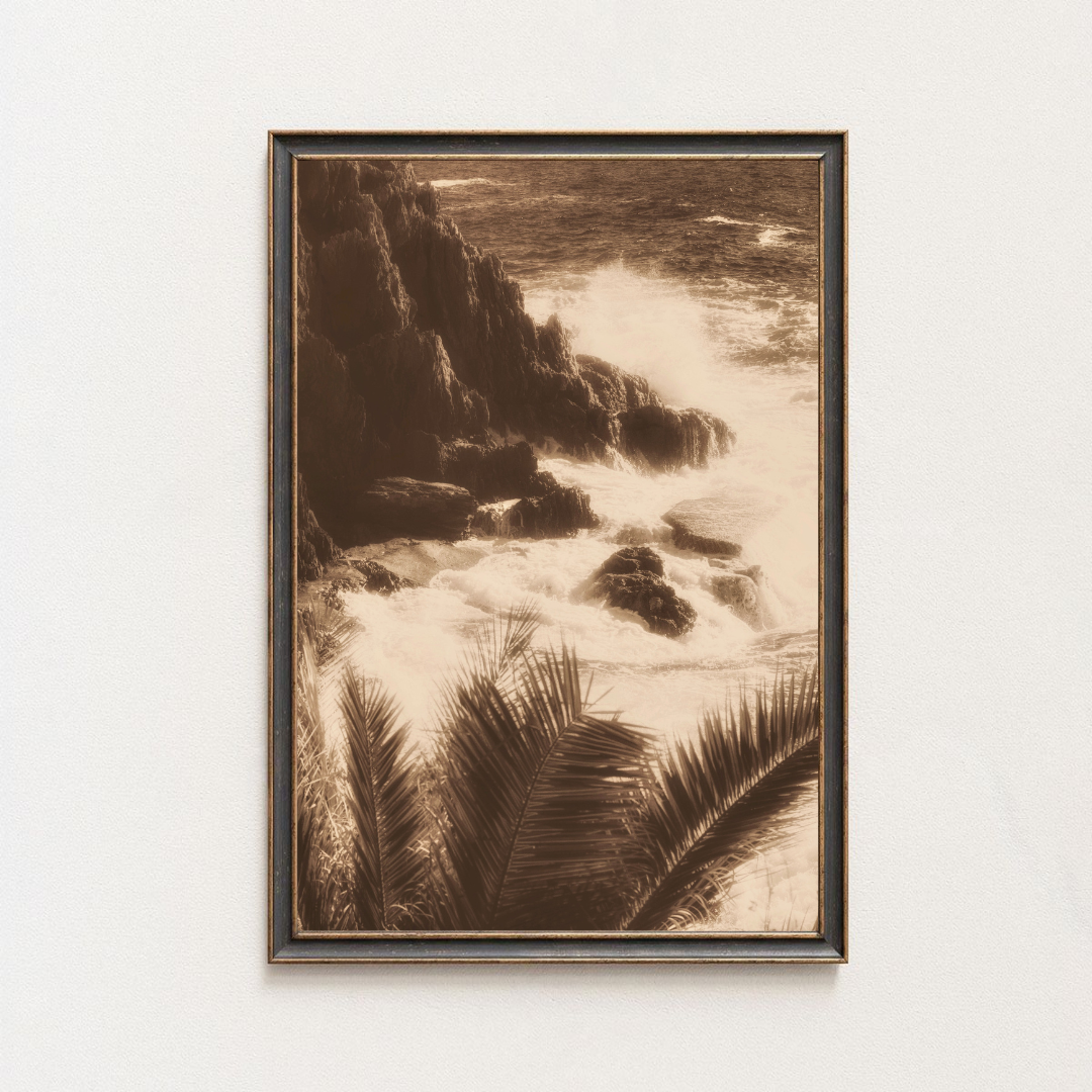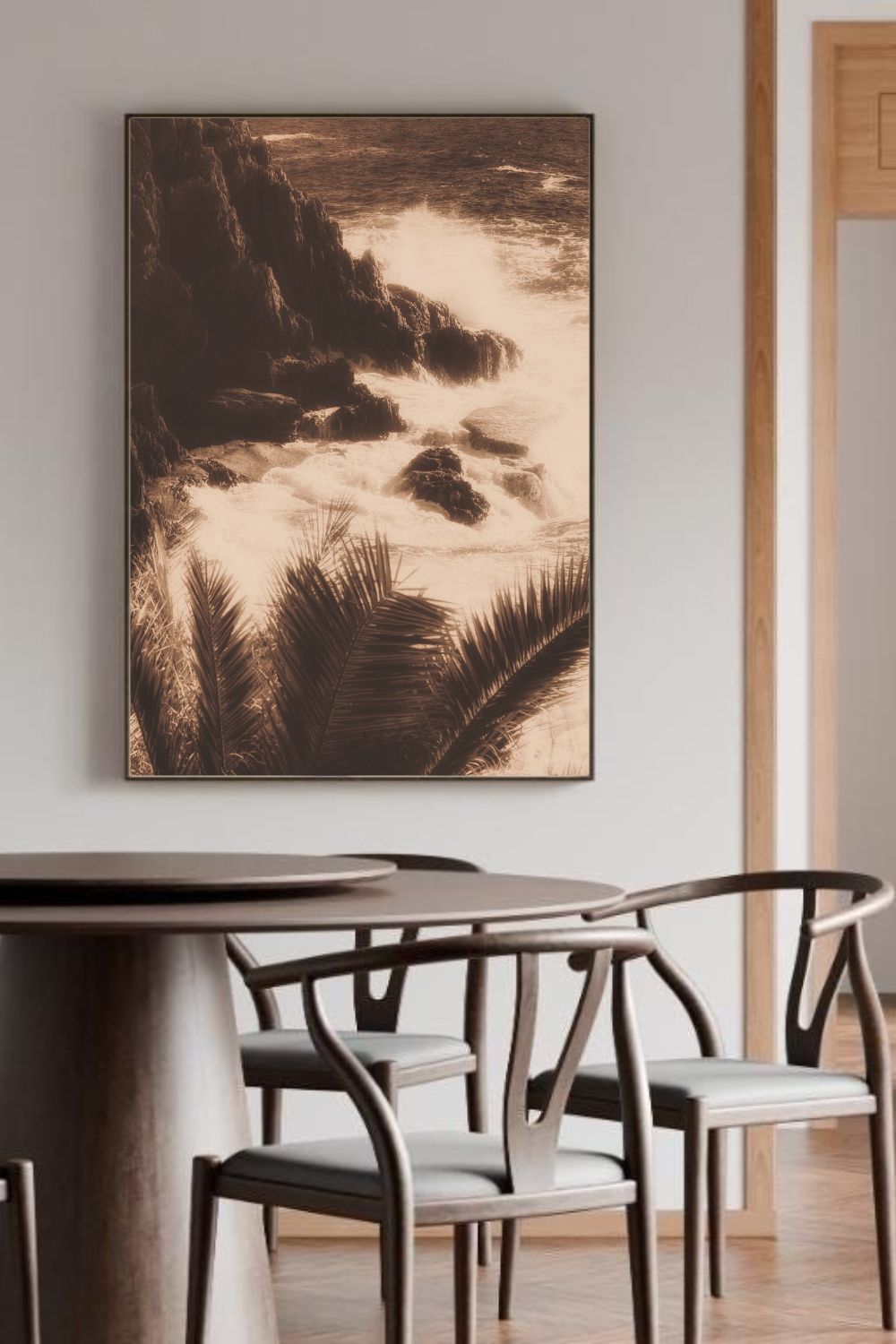Cette photographie capture la force brute des éléments, entre falaises sombres et vagues éclatées. Les palmes au premier plan ajoutent une touche tropicale, comme un murmure végétal dans le tumulte minéral.