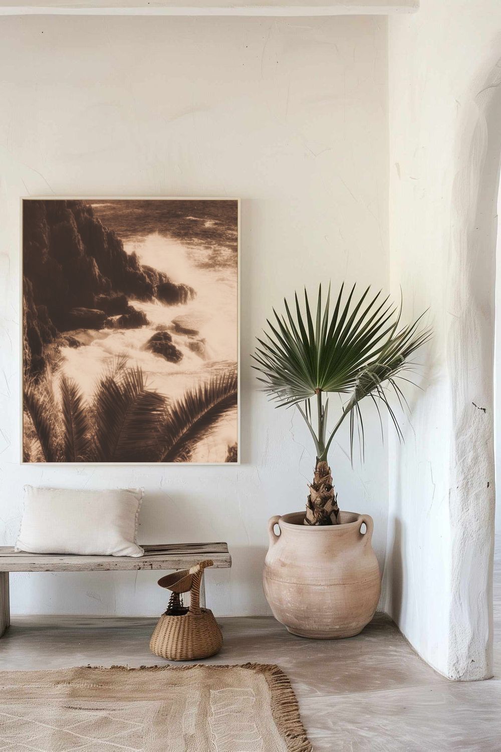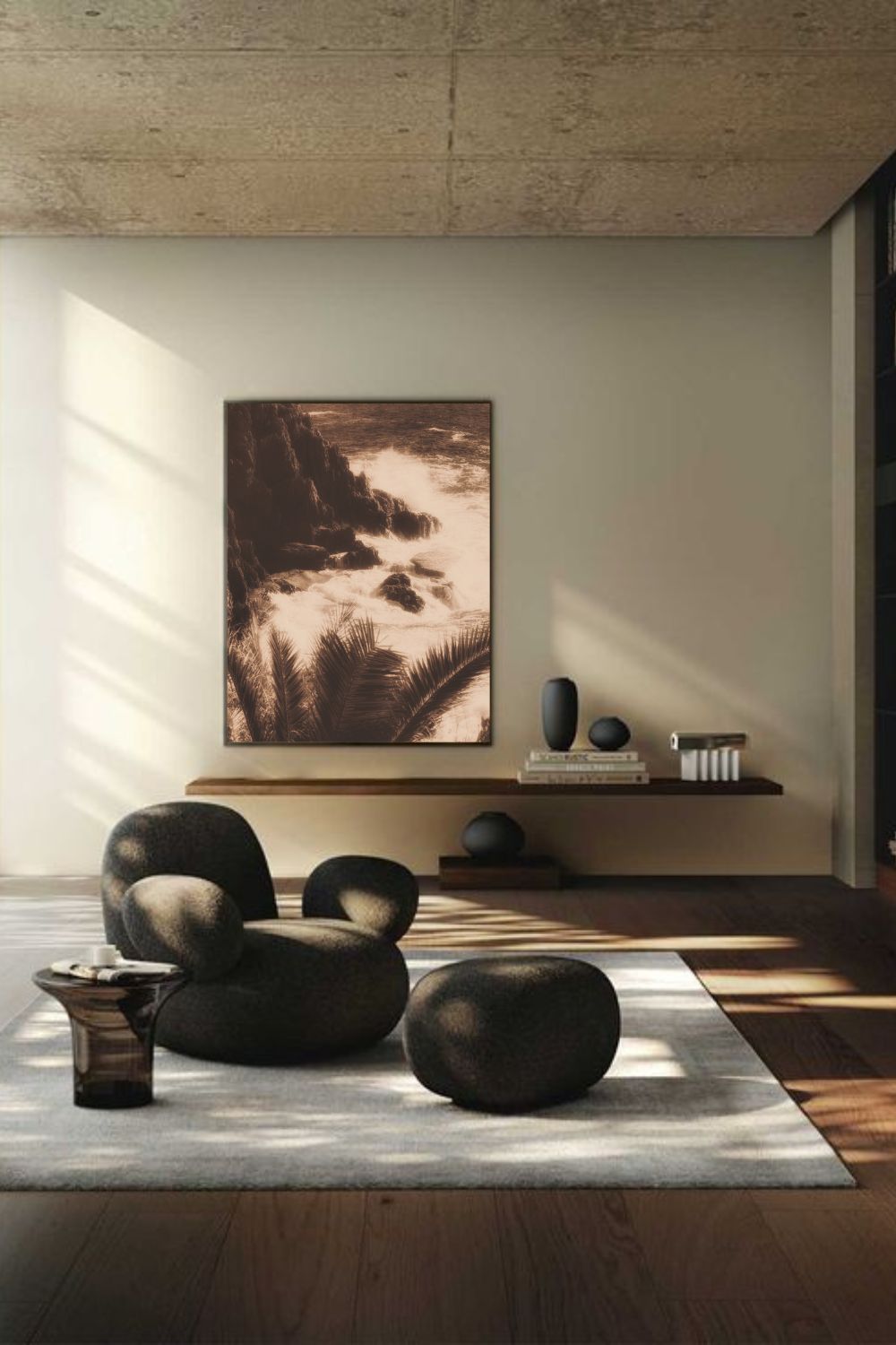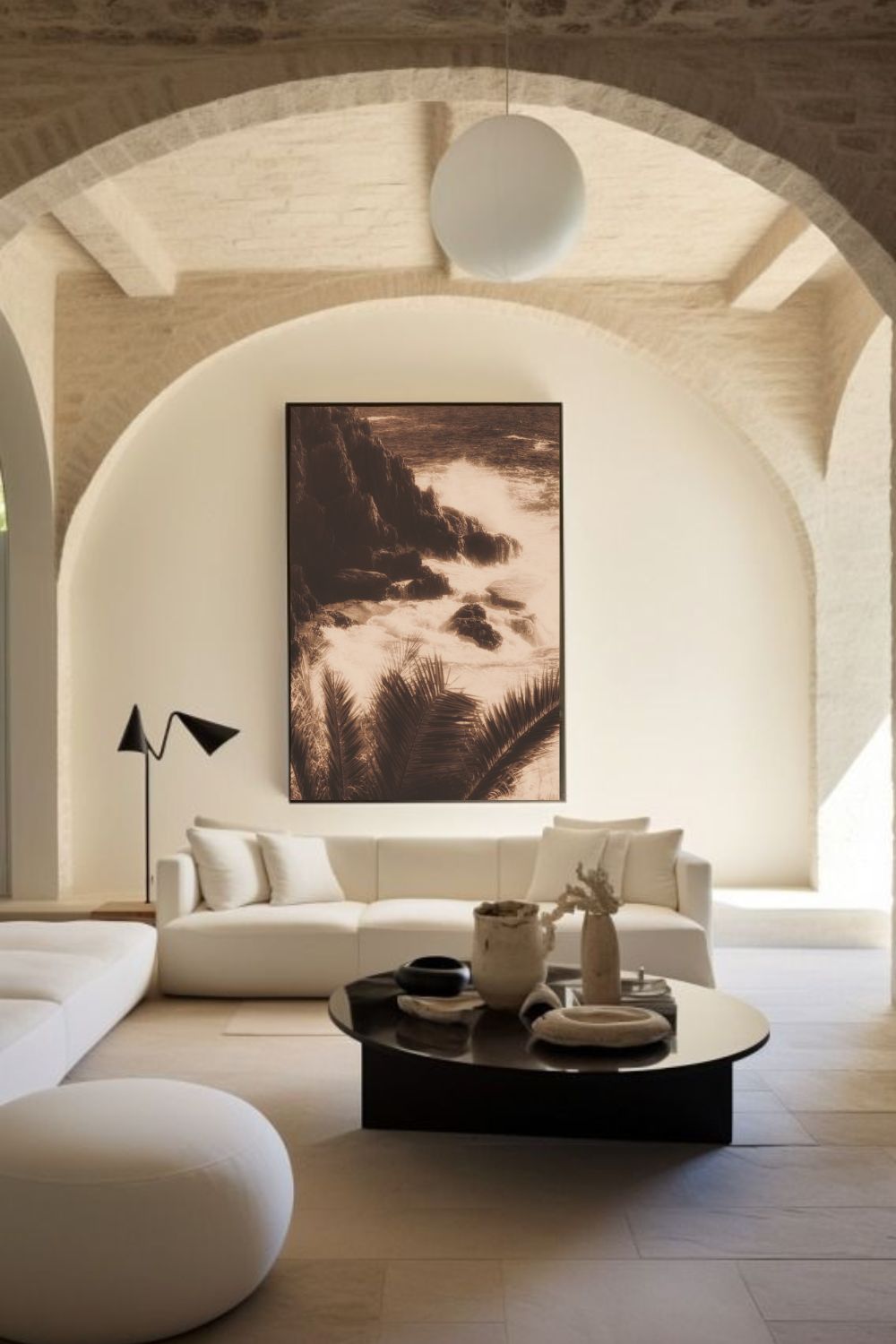 Cette photographie capture la force brute des éléments, entre falaises sombres et vagues éclatées. Les palmes au premier plan ajoutent une touche tropicale, comme un murmure végétal dans le tumulte minéral.